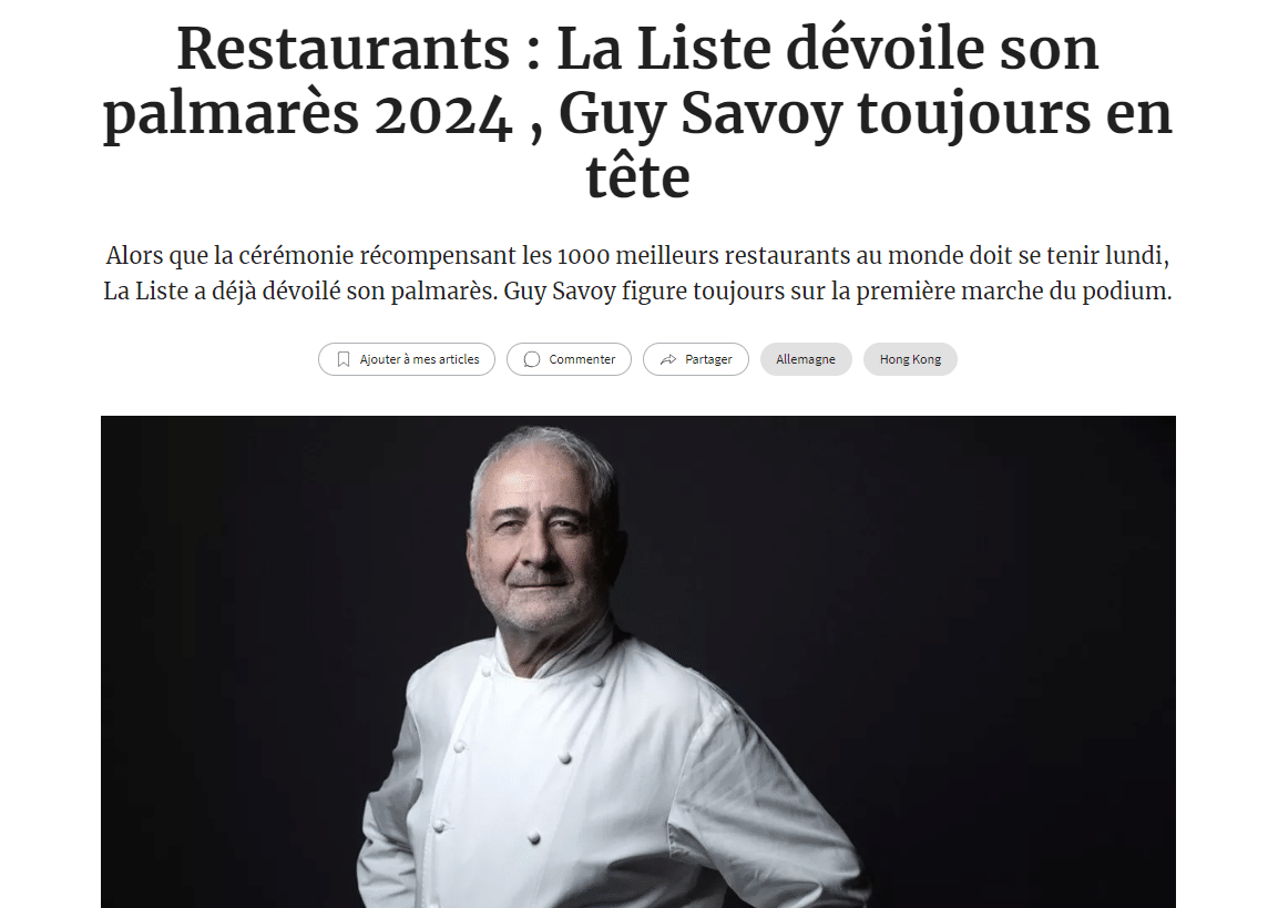 La liste présentait aussi sa sélection des 1000 meilleurs restaurants dans le monde. Un classement réalisé en croisant les évaluations des guides gastronomiques, les revues de presse et réputations des établissements dans 200 pays. La meilleure sélection gastronomique au monde !